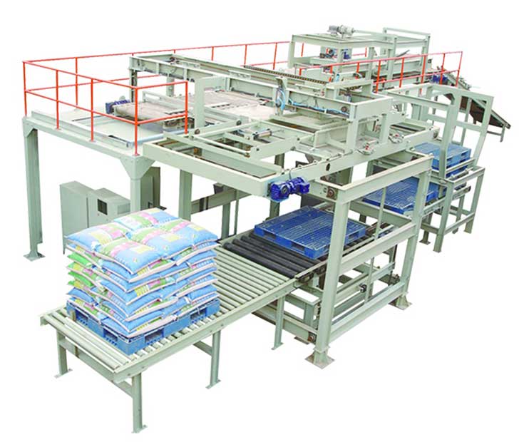 相對來說,機械手安裝方面更靈活一些,可以同時碼放幾個規格品種的成品包裝袋(包裝箱),可以滿足3條輸送線傳輸來的成品。 高位碼垛機只能碼放一種規格和一條輸送線的包裝袋。 碼放效果看,高位碼垛機有很大的優勢,每小時最高速度可以達到1600包,而且垛型整齊美觀,包裝袋不易滑落。 機械手碼垛機的單抓手每小時一般可以達到800包,雙手抓手可以達到1000包左右。機械手的一個弱點是來的包裝袋位置和姿態不是很準確的話容易將帶著抓破。垛型比高位碼垛機和人工碼垛都要差很多,而高位碼垛機不存在這個問題。