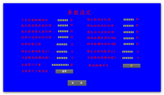 6、當(dāng)前斷線檢測碼數(shù)1和碼數(shù)2是顯示當(dāng)前實(shí)際檢測到的不斷線狀態(tài)下縫完一包編碼器記錄的碼數(shù),此參數(shù)不可設(shè)置,僅為縫包合格碼數(shù)設(shè)定提供參考依據(jù)。