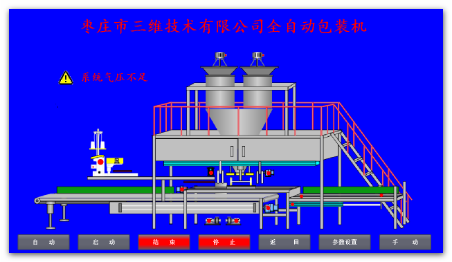 如出現圖中報警信息時,在處理完報警內容并且沒有報警信息后,點擊“自動”按鈕,或外部旋鈕選擇,此時“自動”按鈕顯示為亮綠色,提示切換完成,按儀表啟動按鈕,啟動稱料系統,點擊屏幕或外部“啟動”按鈕,設備啟動時首先經過6秒左右的初始化,報警燈伴隨聲光報警,提示相關人員設備啟動,套袋擺臂執行一個抬起落下動作,以回到準備位置,抱袋小車如不在準備位置則回到準備位置。初始化完成后,屏幕上啟動按鈕亮起,設備進入正常工作狀態。